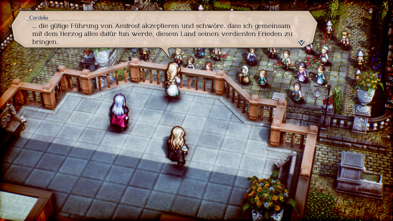 Neben der Entscheidungsfindung ist also der Kern des Spiels das Kämpfen. Triangle Strategy ist ein HD-2D-Spiel. Demnach ist die 2D-Spielwelt in einer teils isometrischen und 3D-Darstellung in einer Third Person-Perspektive zu erkunden.