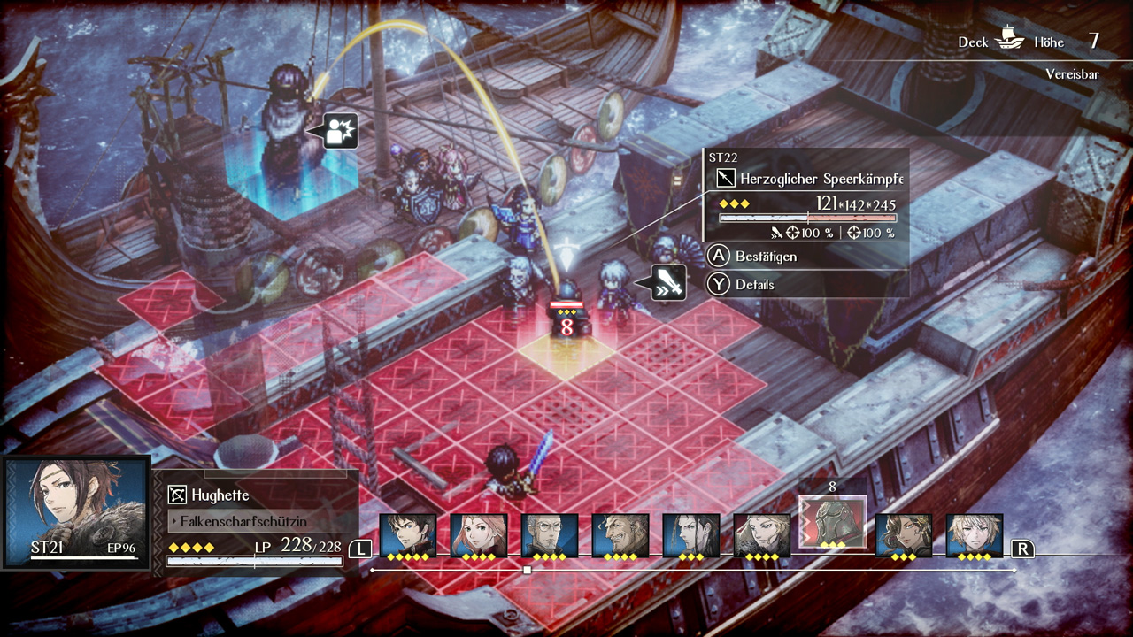 Mal das Mikromanagement mit Ausrüstungen, Items, Läden, Verbesserungen, Level, Statistiken, Klassen und Fähigkeiten beiseite. Das könnt ihr alles grundsätzlich von Triangle Strategy erwarten, würde hier aber meinen Rahmen sprengen, alles einzeln zu erläutern. Wir haben hier ein SRPG vor uns, und wie man anhand des obigen Screenshots sieht, sogar im Kampf recht leicht überschaubar.