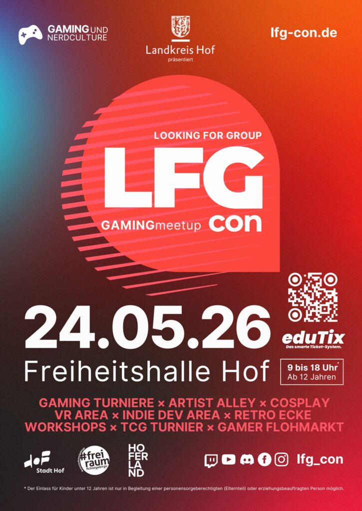 Eigentlich verrät es das Plakat ja schon, was ich jetzt hier noch schreiben wollte. Daher will ich euch hier auch ein bisschen auf die bisherige Geschichte mitnehmen. Die „LFG Con“ wird in diesem Jahr zum dritten Mal stattfinden und ist seit Beginn ein Herzensprojekt, das durch die Zusammenarbeit von Politik, Industrie und vor allem Content-Creators entstanden ist. Dieses Dreiergespann wirkt jetzt schon im dritten Jahr zusammen und wir schon sehr gespannt, welche Highlights und Inhalte uns dieses Jahr in der Hofer Freiheitshalle begegnen werden.