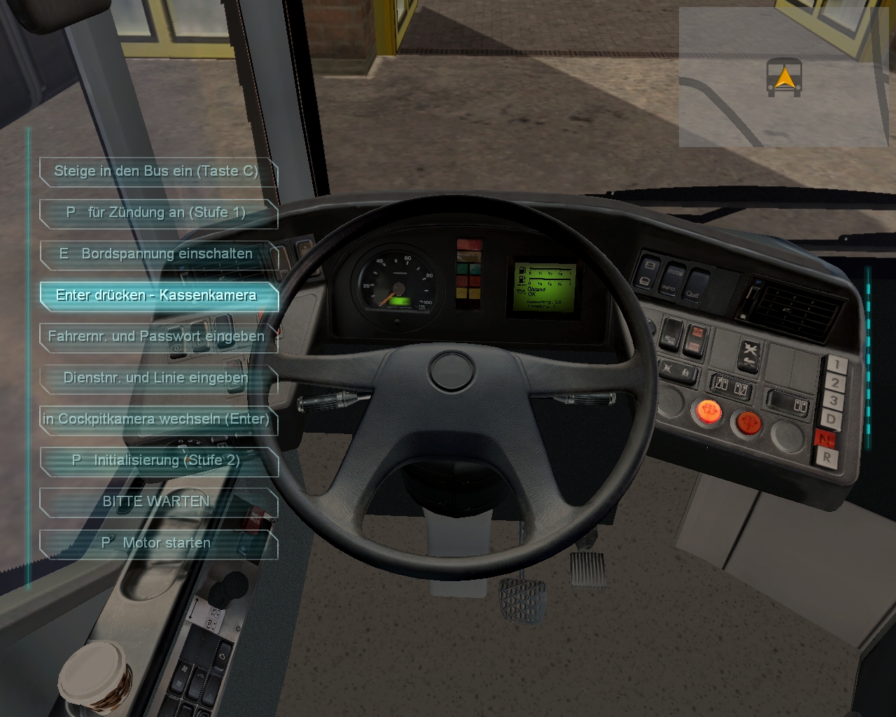 Ist man in der Garage, kann man sich noch den Fahrplan ansehen und sich umsehen – wenn nicht dann steigen wir mal in den Bus. Wir nehmen auf den Fahrersitzplatz platz und starten die Zündung und die Bordspannung. Ein eher vom Sinn befreites Feature ist, dass man seinen Sitz einstellen kann, damit man den perfekten überblick im Bus behält. Hat man alles eingestellt, kann es leider noch nicht los gehen. Jetzt muss man sich erst mal am Fahrkartencomputer anmelden. Wer hätte es gedacht: man braucht seine Fahrernummer und Passwort, das ist aber noch nicht alles.Desweiteren kann man sich noch aussuchen, welche Linie gefahren werden soll. Hat man alle Informationen in den Computer gehackt, dann Handbremse lösen, Licht an und Los geht’s.