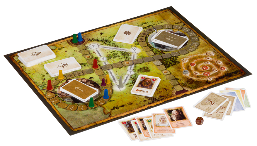 Es erklärt sich von selbst, dass uns dieses Vorhaben nicht allzu leicht gemacht wird und uns zahlreiche Gefahren wie Trolle erwarten. Wir starten gemeinsam mit Bilbo vom Startfeld im Auenland. Während jeder Spieler jeweils zwei Zwerge einer Farbe übernimmt, wird Bilbo in jedem Spielzug, die passenden Bilbo- oder Pony-Karten vorausgesetzt, von jedem Spieler mitgezogen. Mittels den Bewegungskarten darf man während seines Spielzug einen der Zwerge entlang des Pfades weiter bewegen. Wer dabei eine Würfelkarte legt darf sich den Wert erwürfeln. Der Spielweg führt uns durch Bruchtal, die Trollhöhen und schließlich durch das Nebelgebirge.
