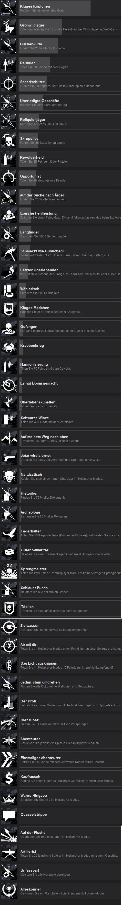 Und hier natürlich noch einmal der Überblick über alle möglichen Trophäen/Errungenschaften/Erfolge: